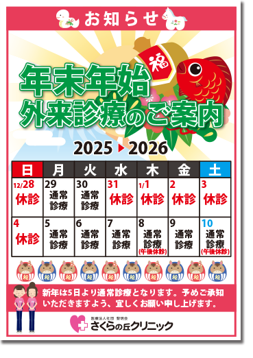 年末年始の外来診療につきまして、下記の期間が休診となります。